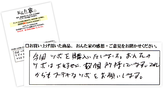 S様は、小鹿田焼の壺がお好きでいらっしゃるんですね。