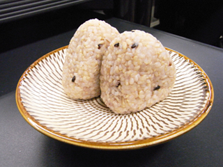 上の写真:小鹿田焼に盛り付けられた発芽十六雑穀のおにぎり