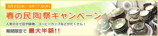 いつもおんた家をご利用いただきありがとうございます。5月17日(木)17時まで開催しておりました春の民陶祭キャンペーンは好評につき終了いたしました。多くのご愛顧をいただき誠にありがとうございました!今後ともおんた家をよろしくお願いします。