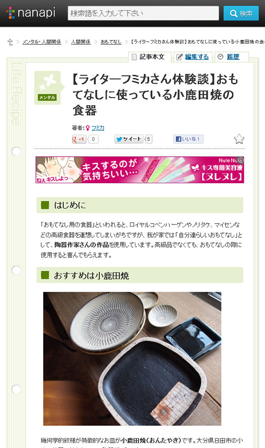 掲載元:nanapi 「【ライターフミカさん体験談】おもてなしに使っている小鹿田焼の食器」
