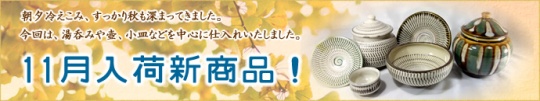 11月新商品を販売開始しました!朝夕冷え込み、すっかり秋も深まってまいりました。今回は、湯のみや壺などを中心に仕入れいたしました。数量が限られておりますので、お気に入りの器はお早めにご購入ください!
