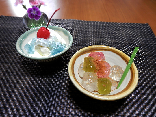 青緑のフチの小鉢には、バニラアイスとラムネゼリーを