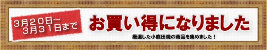 期間限定のお得情報!『お買い得になりました』 期間:3月20日(日)18時より3月31日(木)13時まで人気の厳選した小鹿田焼商品を集めました。期間限定のためお見逃しなく!